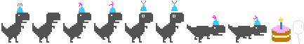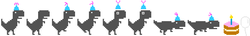 क्लासिक डायनासोर गेम का उत्सव संस्करण — जन्मदिन का केक, पार्टी हैट और गुब्बारे — Chrome की 10वीं वर्षगांठ के लिए बनाया गया।